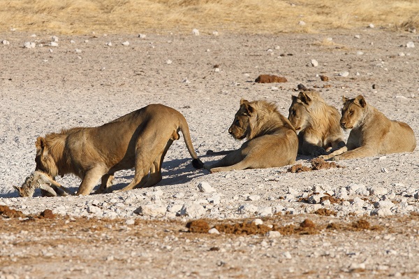As the Lioness approached, she uttered a few low calls and within seconds from the right, three young male Lions and a young Lioness appeared from seemingly nowhere. The males were all teenagers with manes just beginning to sprout and almost certainly all four were the offspring of this pair of adult Lions. One of these boys had lost half his tail and the stub was still raw and bloody.