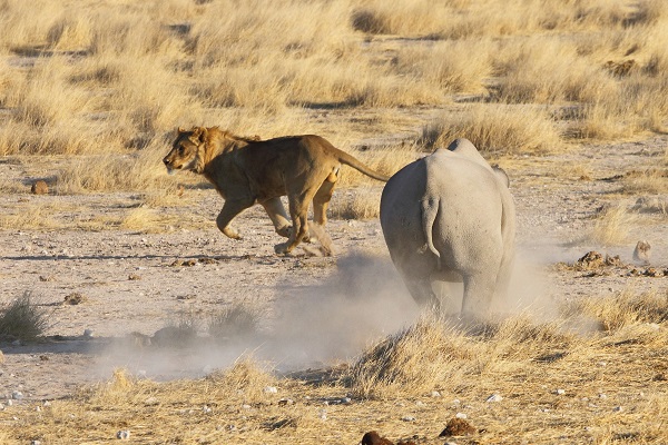 The five Lions lay down again alongside the waterhole to survey their surrounds. However, our afternoon’s entertainment wasn’t over yet! A Black Rhinoceros next entered the scene. It’s unusual to see these endangered animals in Etosha during the day; they prefer to visit the waterholes and drink in the cooler evening hours. However, this fellow was obviously thirsty and started making his approach. He was uneasy about the presence of the Lions and backed off for a while.