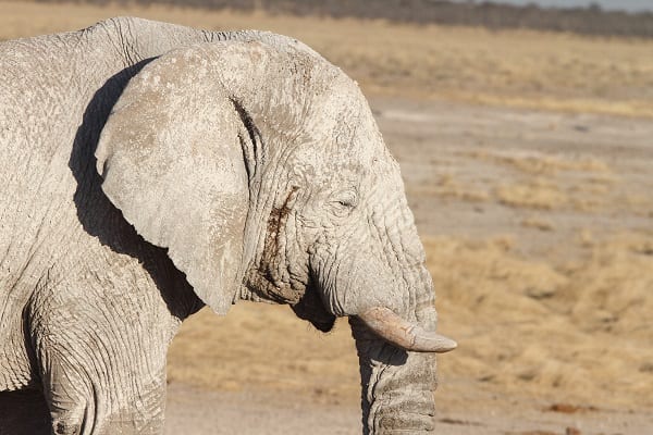 Dessa avslappnade jättar är färgade vita av det bleka dammet från pannan och deras korta, brutna betar är typiska för denna miljö som ger lite mineraler för hälsosam elfenbenstillväxt, i kombination med en mycket hård jord som skadar eventuella grävda betar.