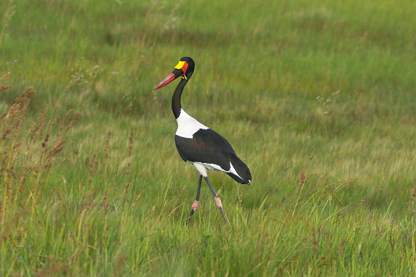第二大,也是吸引力规模的另一端,是令人惊叹的鞍嘴鹳。鞍嘴鹳只比鹳短一些,但体型更优雅,在亚洲还有一个姊妹物种——黑颈鹳。马鞍嘴鸟更严格地限制在湿地环境中,在那里它们擅长用巨大的上翘嘴来捕捉自己的鱼。它们还捕食青蛙和螃蟹。有时,他们必须保护自己的捕获物免遭非洲鱼鹰的袭击,这些非洲鱼鹰一看到鞍嘴鸟成功捕获了一条鱼,就会俯冲下来。它们表现出微妙的性别二态性,雄性有黑色的眼睛,悬挂着黄色的肉垂,翅膀上的颜色更黑,而雌性有明亮的黄色眼睛,没有肉垂和令人难以置信的白色翅膀,在飞行中绝对引人注目。它们的名字取自它们喙根部裸露的红色皮肤上的黄色“马鞍”。鞍嘴鹳在非洲的分布与鹳鹳相似。